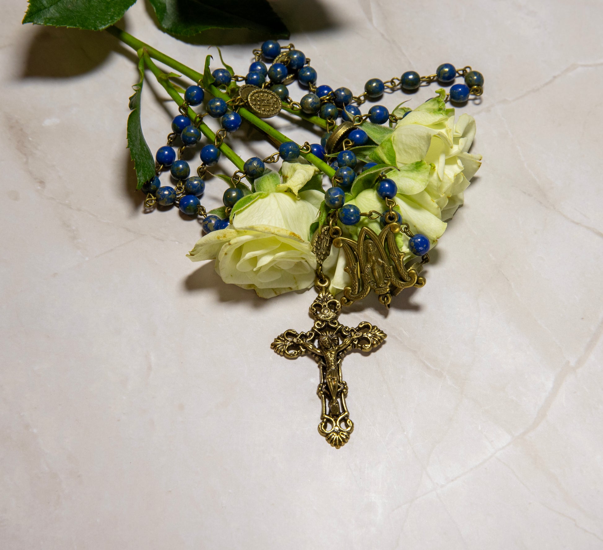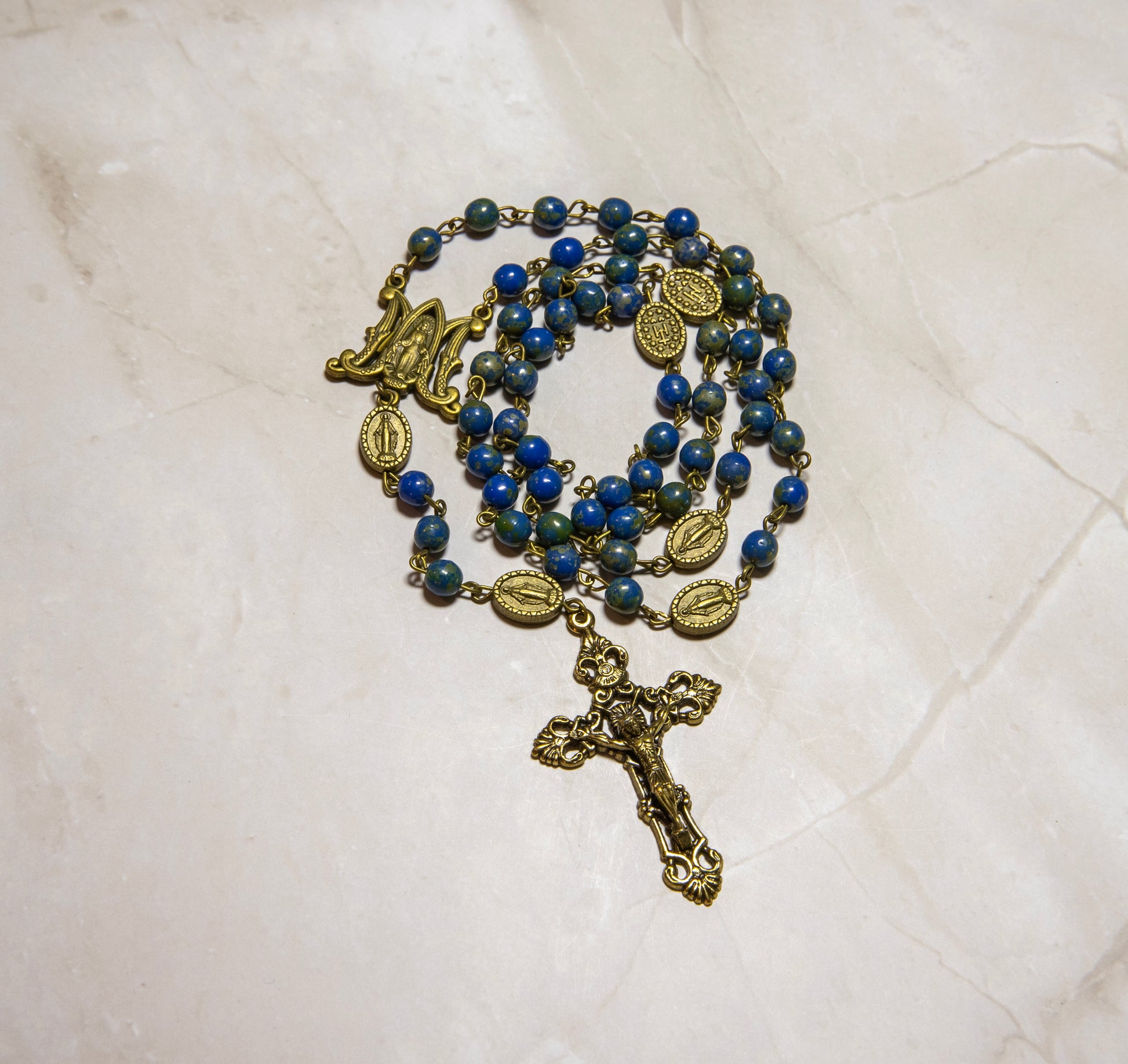 The Miraculous Medal rosary features Czech glass beads paired with bronze Miraculous Medal Our Father beads. At its center lies an elegant bronze medal showcasing Our Lady, complemented by an intricately designed and refined crucifix.