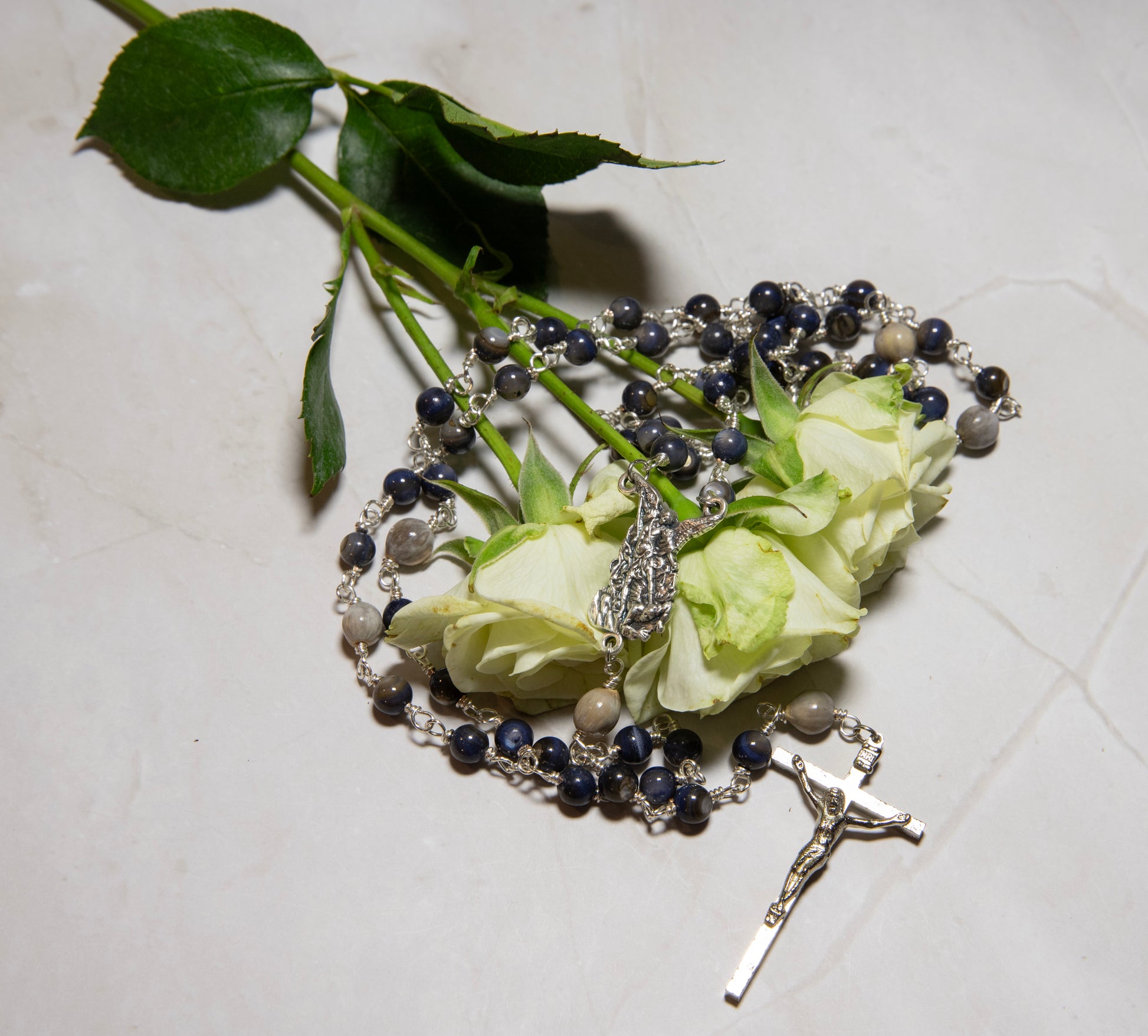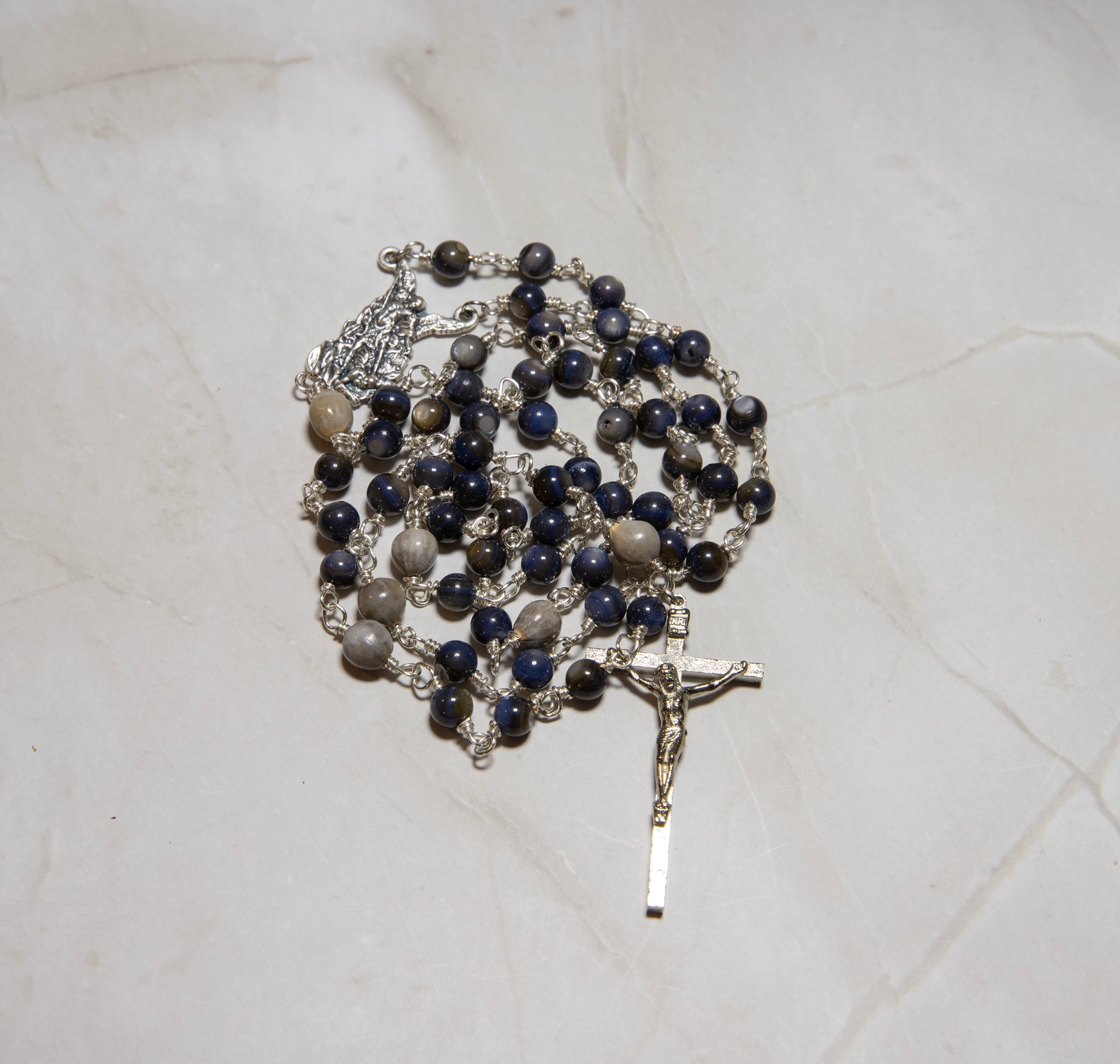 The St. Michael Rosary features shell beads with Jobs Tears used for the Our Father beads. Each link is meticulously formed with silver-plated wire. The centerpiece displays St. Michael, engraved on the reverse with the words "Pray for Us." The crucifix is also silver plated. St. Michael, pray for us.